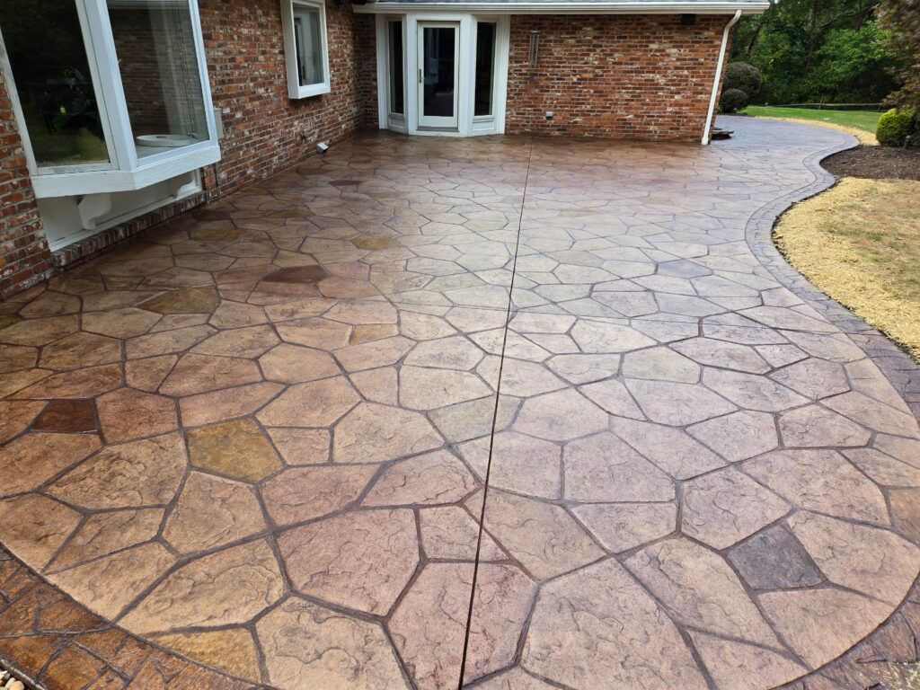 Stamped patios also allow for design flexibility. We can combine different patterns, borders, and colors to match the style of your home. The surface requires less maintenance than traditional pavers, and sealing helps protect against stains, moisture, and fading.